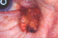 Basal cell carcinoma is a type of skin cancer that occurs most commonly on the face or neck, often near an eyelid or on the nose. The tumor cells are thought to originate from the basal, or deepest layer of skin.